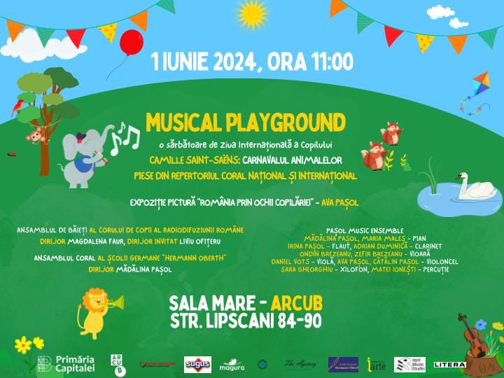 Sâmbătă, 1 iunie 2024, la ora 11:00, va avea loc evenimentul dedicat copiilor „Musical Playground, o sărbătoare de Ziua Internațională a Copilului”, organizat de către Asociația Institutul Internațional de Arte în colaborare cu Școala Germană „Hermann Oberth” și The Agency, cu sprijinul Primăriei Capitalei, prin ARCUB – Centrul Cultural al Municipiului București.